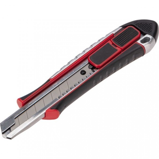 Нож с выдвижным сегментированным лезвием REXANT предназначен для реза различных материалов: пластика, линолеума, кровельных материалов, гипсокартонных и гипсолитовых плит, бумаги, картона. Прочный металлический корпус обладает удобной обрезиненной рукояткой, что увеличивает эксплуатационные свойства инструмента. Стальное лезвие фиксируется автоматически. Когда крайний сегмент затупляется, его можно отломить и продолжить использовать инструмент. Добавлена функция мгновенной резки при помощи дополнительного фиксатора с автовозвратом лезвия. В основании корпуса предусмотрено отверстие для подвеса ножа. Качественные материалы обеспечивают долгий срок службы инструмента.